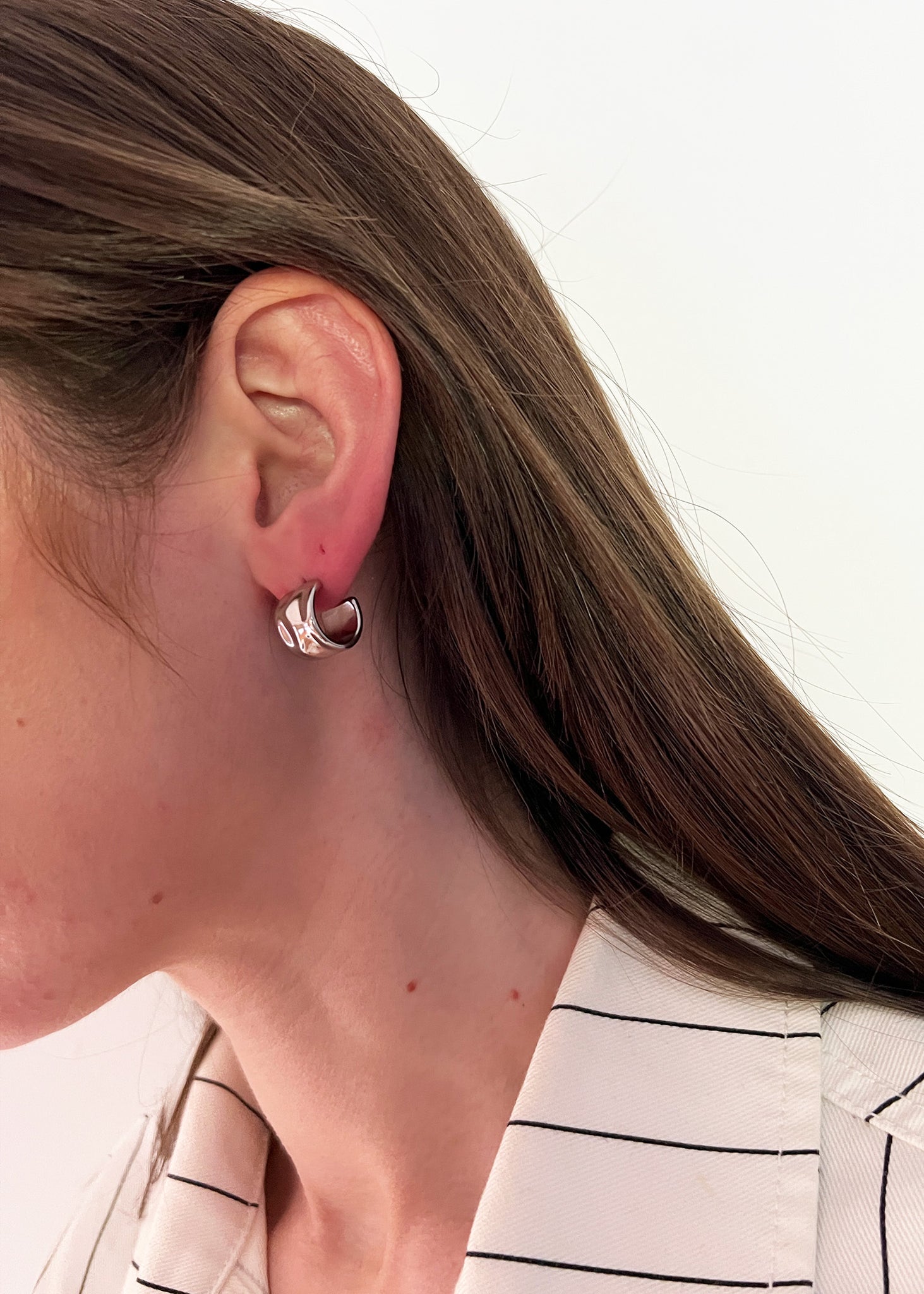 The Jax Hoop silver features a bold, wide design with a textured finish and a butterfly clasp for easy wear. It’s waterproof and comfy, perfect for adding a splash of sparkle to your daily adventures.
