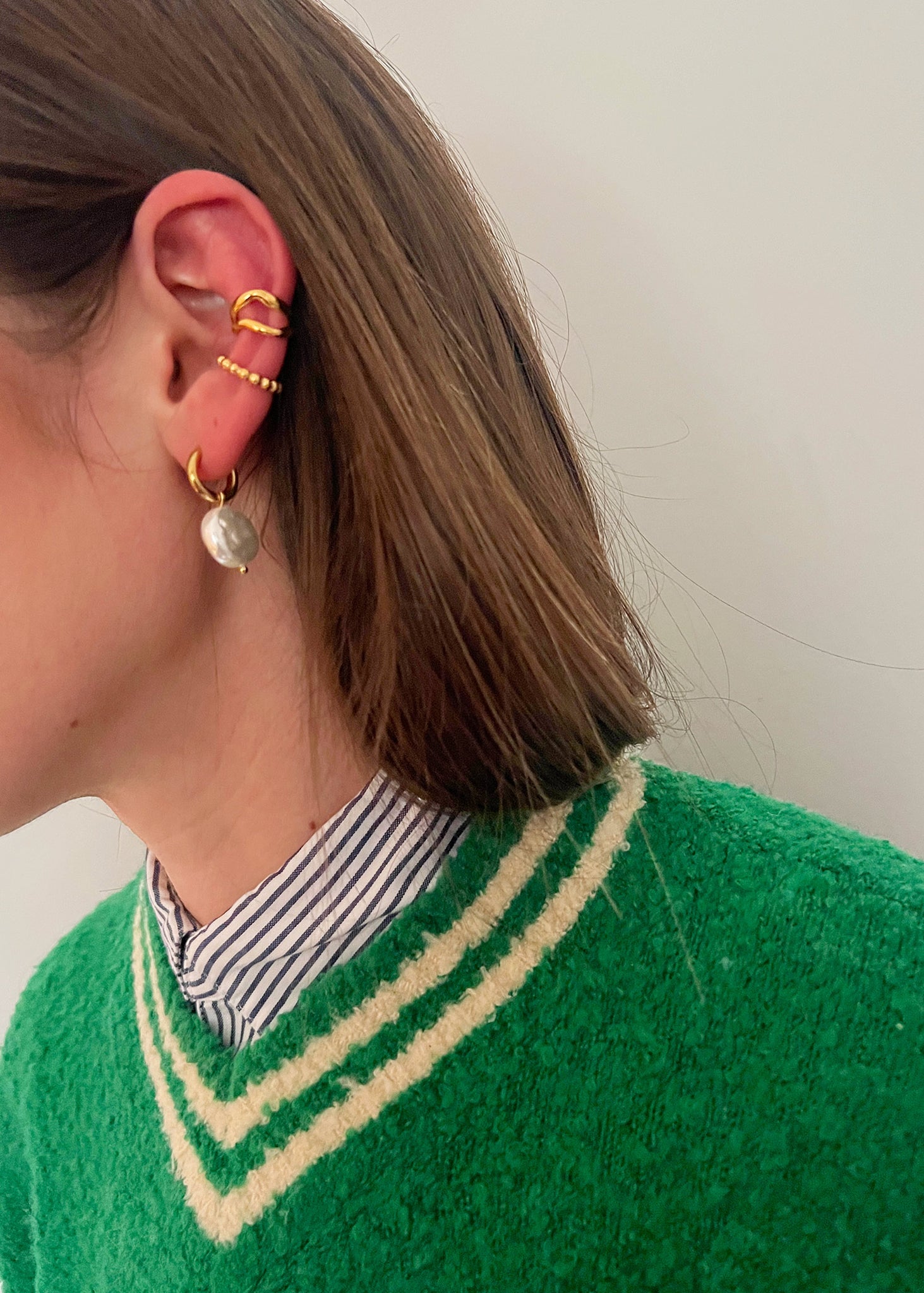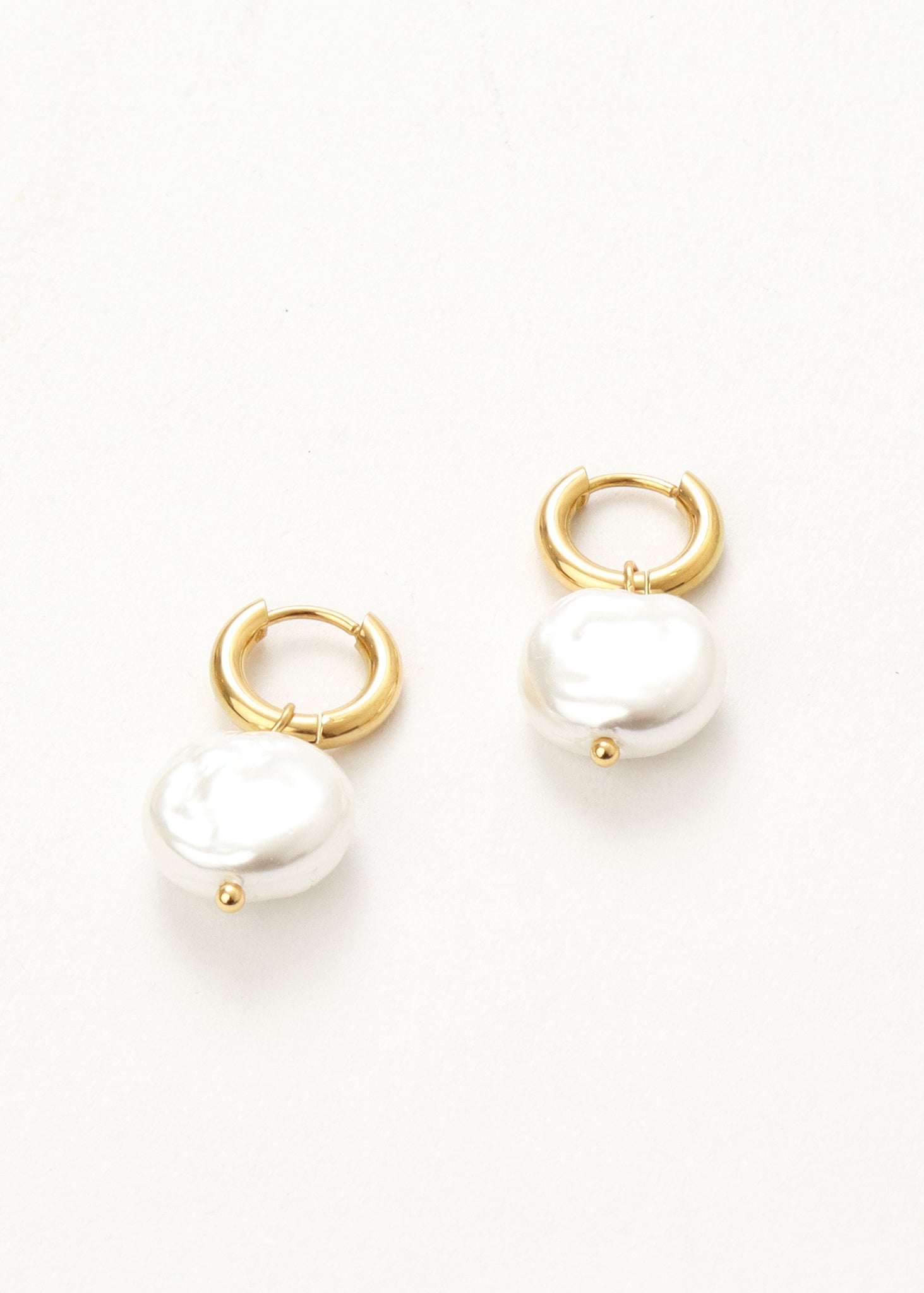 Ira 8mm gold hoop with flat round pearl drop.